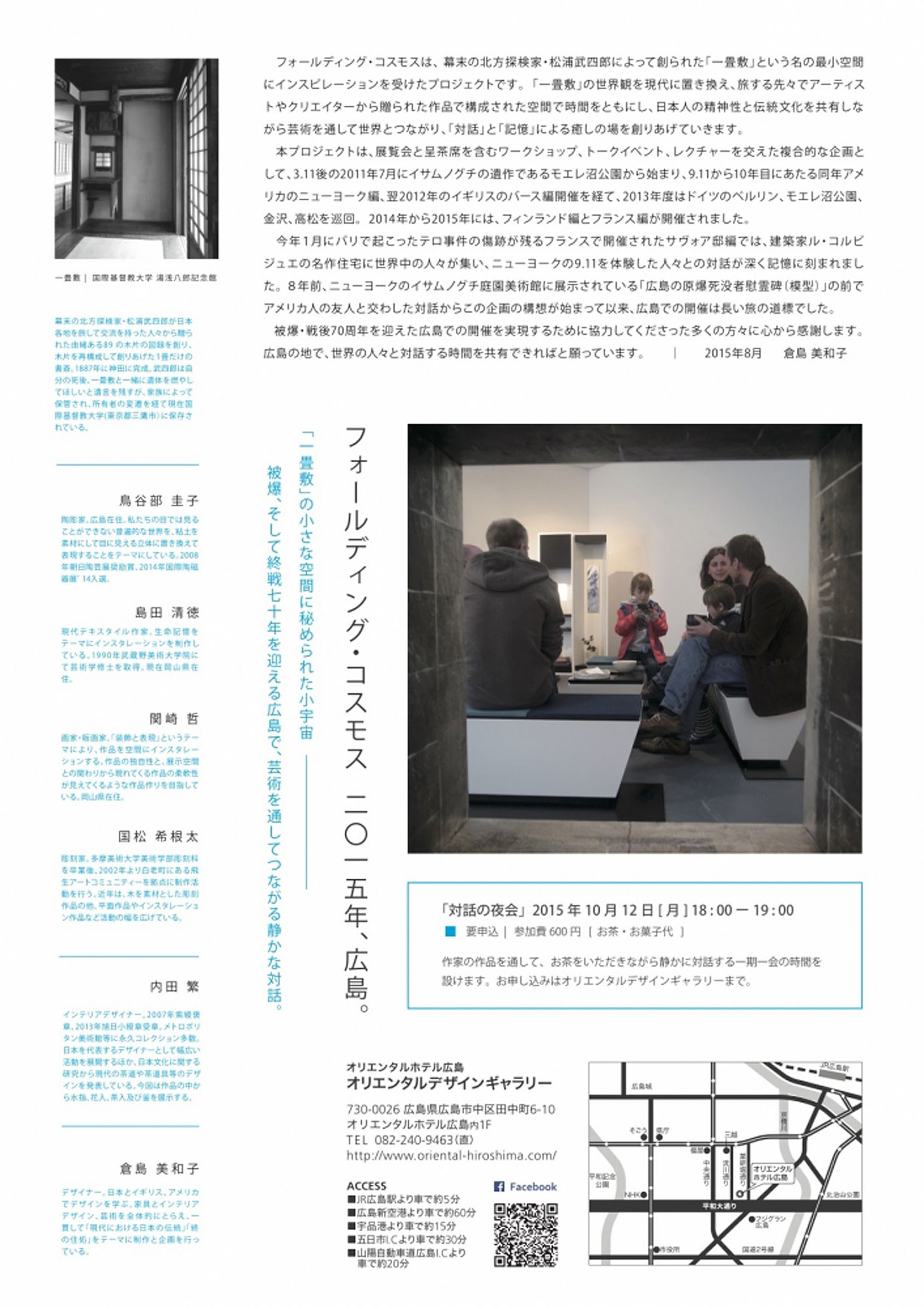 今年1月にパリで起こったテロ事件の傷跡が残るフランスで開催されたサヴォア邸編では、建築家ル・コルビジュエの名作住宅に世界中の人々が集い、ニューヨークの9.11を体験した人々との対話が深く記憶に刻まれました。8年前、ニューヨークのイサムノグチ庭園美術館に展示されている「広島の原爆死没者慰霊碑(模型)」の前でアメリカ人の友人と交わした対話からこの企画の構想が始まって以来、広島での開催は長い旅の道標でした。被爆・戦後70周年を迎えた広島での開催を実現するために協力してくださった多くの方々に心から感謝します。広島の地で、世界の人々と対話する時間を共有できればと願っています。