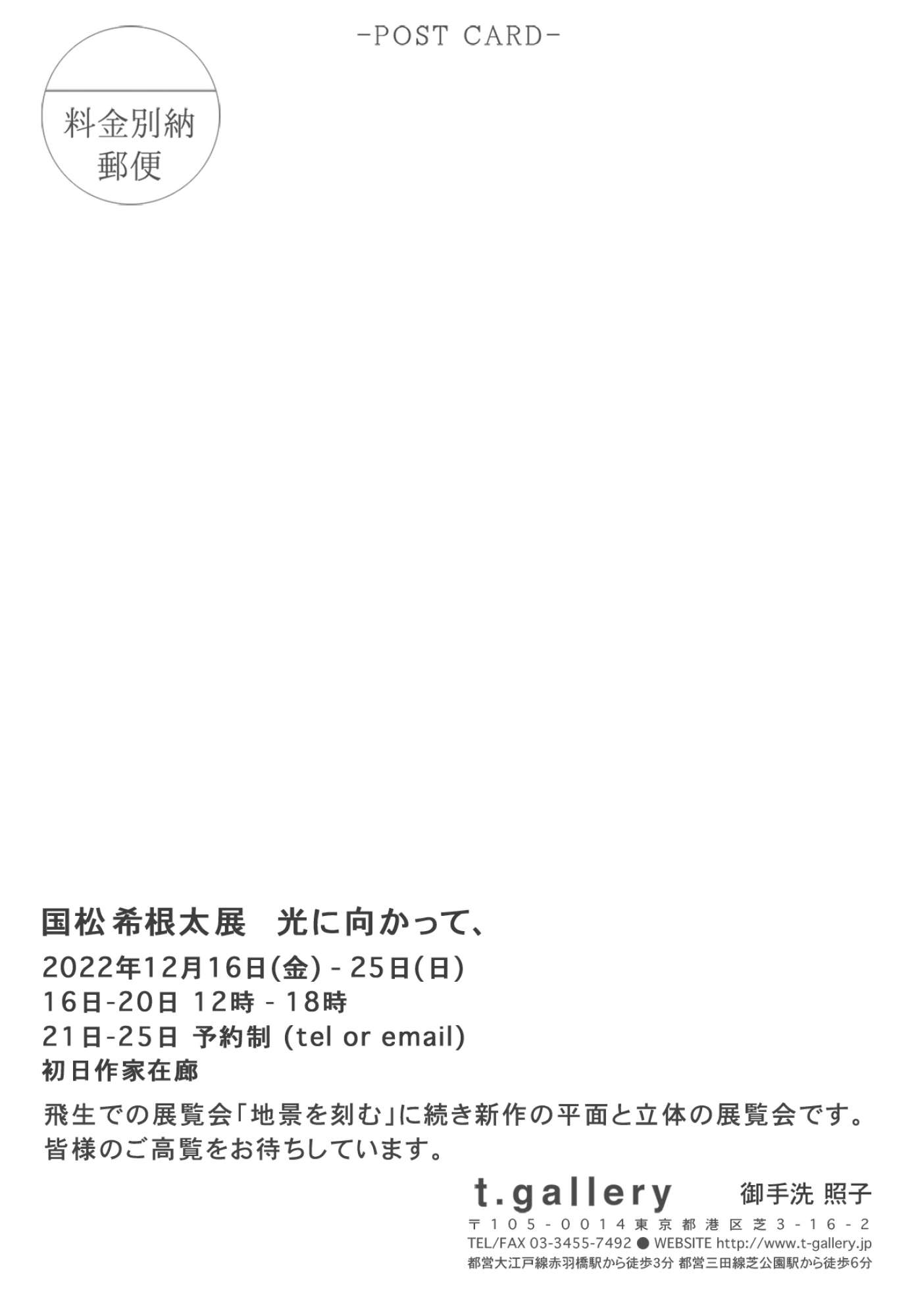 "国松 希根太展 光に向かって、"(2022年12月16日-12月25日) Photo: Kai Takihara 2022年12月16日-12月25日t.gallery"国松 希根太展 光に向かって、"会 期:2022年12月16日(金)-12月25日(日)時 間:16日-20日 12:00-18:00 :21日-25日 ※予約制(tel or email)会 場:t.gallery住 所:東京都港区芝3-16-2 1F電 話:03-3455-7492作家在廊日 12月16日(火)