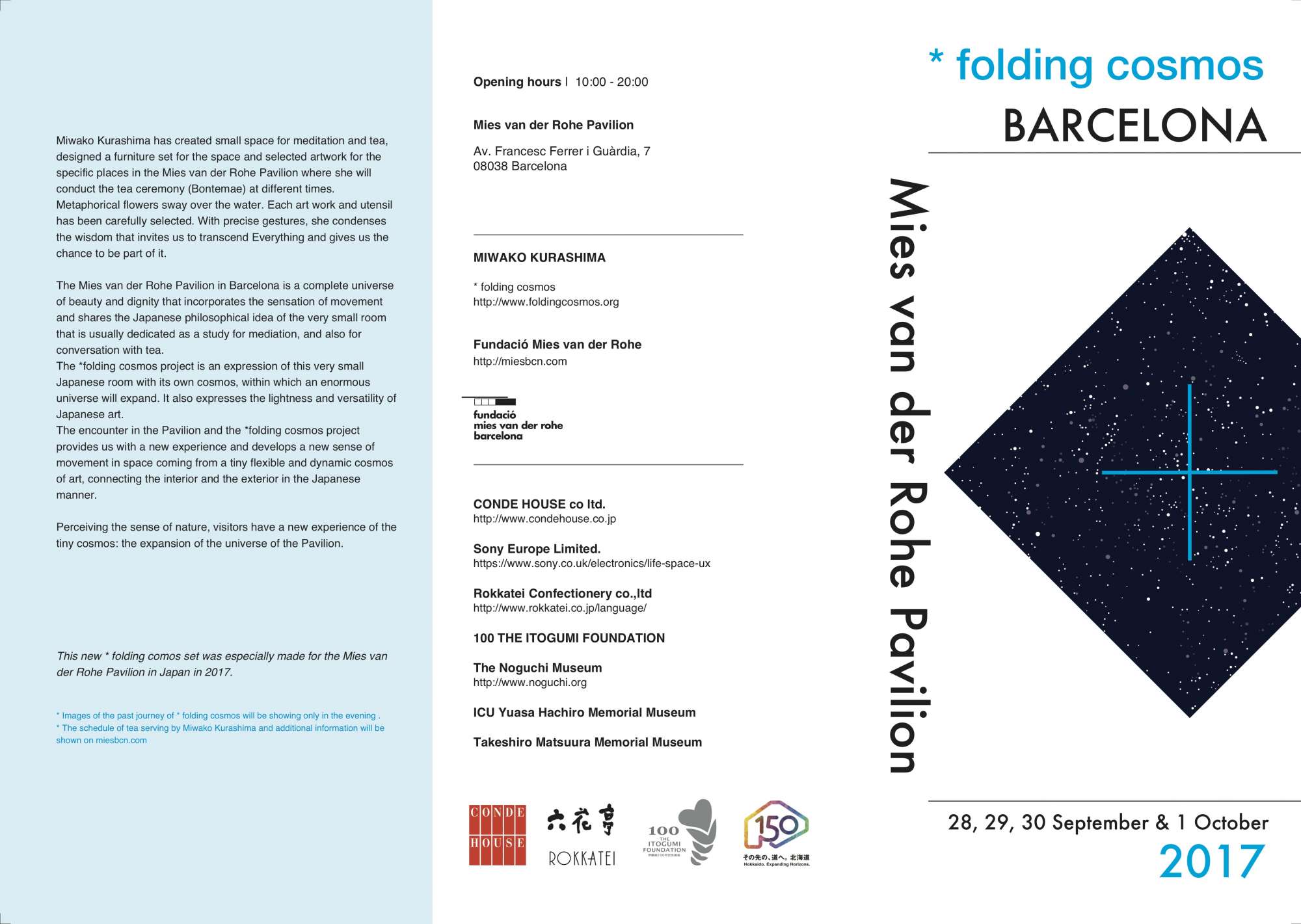 フォールディング・コスモスは、ミース・ファン・デル・ローエ財団との共催で、2017年9月28日 [木] から10月1日 [日]の4日間、 バルセロナのミース・ファン・デル・ローエ・パビリオンで、「フォールディング・コスモス・バルセロナ|ミース・ファン・デル・ローエ・パビリオン」を開催致します。