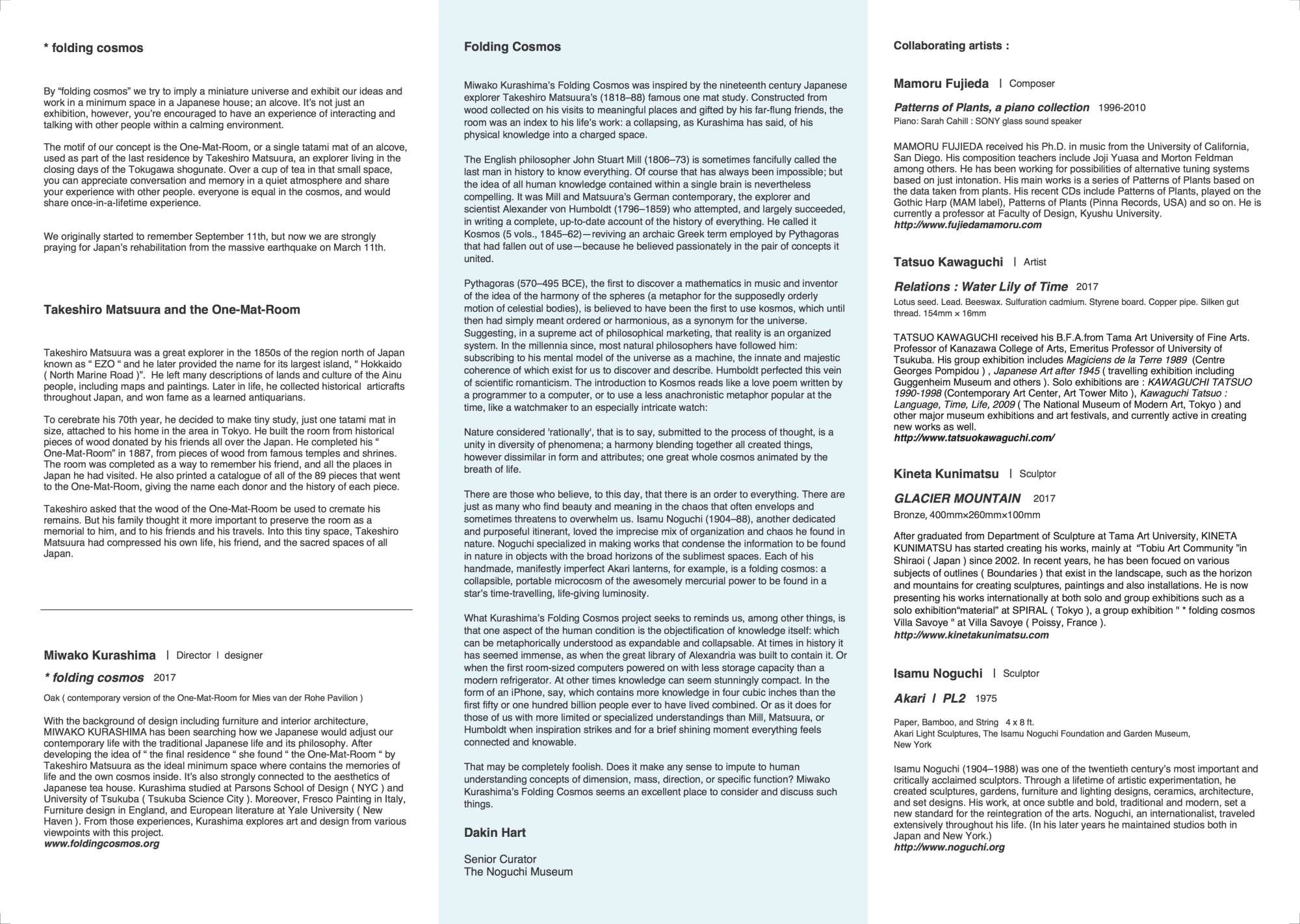 協力:ソニー ヨーロッパ | ノグチ・ミュージアム | ICU湯浅八郎記念館 | 松浦武四郎記念館 | 北海道150年協賛企画